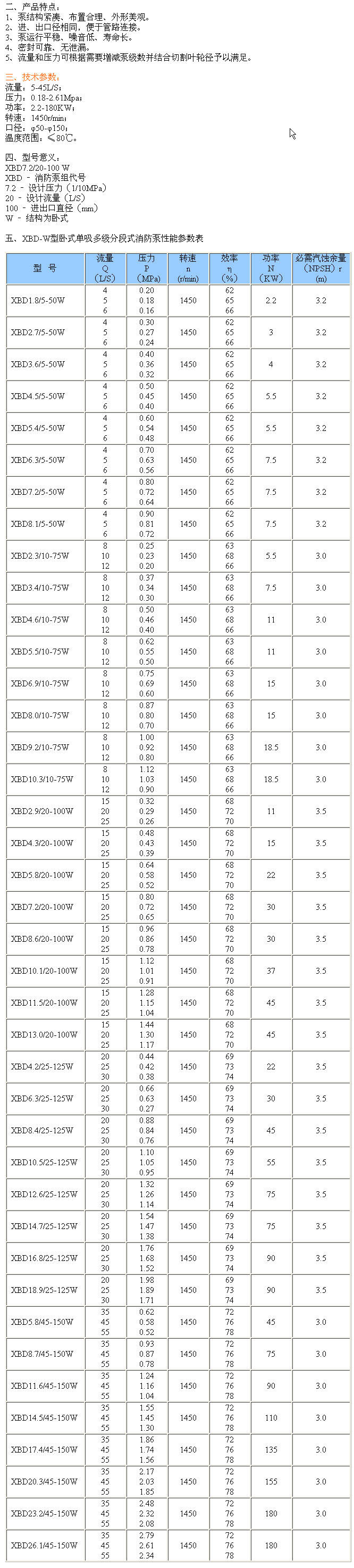 XBD-W型臥式單吸多級分段式消防泵![]() XBD-W型臥式單吸多級分段式消防泵 更多信息一、產(chǎn)品概述: XBD-W型臥式單吸多級分段式消防泵,是最新開發(fā)生產(chǎn)的節(jié)能系列產(chǎn)品。具有效率高、運行噪音低、抗汽蝕性能好、結(jié)構(gòu)合理、使用壽命長等顯著優(yōu)點。供輸送不含固體顆粒的清水及物理化學(xué)性質(zhì)類似于水的液體之用,主要用于消防系統(tǒng)增壓送水、也可應(yīng)用于廠礦給排水、高層建筑增壓送水、遠(yuǎn)距離送水、采暖、浴室、鍋爐冷暖水循環(huán)增壓、空調(diào)制冷系統(tǒng)送水及設(shè)備配套等場合。 本司生產(chǎn)的XBD-W型系列消防泵其性能、技術(shù)條件符合國家新頒布的GB6245-1998《消防泵性能要求和試驗方法》標(biāo)準(zhǔn)的要求,產(chǎn)品經(jīng)國家消防裝備質(zhì)量監(jiān)督檢測中心測試合格,獲上海市消防產(chǎn)品認(rèn)可證書。 |