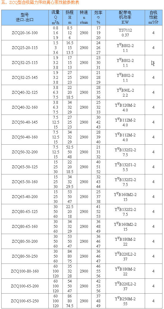 ZCQ型自吸磁力泵一、產品概述: ZCQ型自吸磁力傳動離心泵(簡稱自吸磁力泵)是將永磁聯軸器的工作原理應用于離心泵的新產品,設計合理,工藝 ,具有全密封,無泄漏,耐腐蝕的特點,其性能達到國外同類產品的 水平.磁力泵結構緊湊,外形美觀,體積小,噪音低,運行可靠,使用維修方便.可 應用于化工,制藥,石油,電鍍,食品,電影照相洗印,科研機構,國防工業等單位抽送酸,堿液,油類,稀有貴重液,鍍液,揮發性液體,以及循環水設備配套.特別是易燃,易爆,揮發性液體的抽送,選用此泵則更為理想. 二、工作原理: 本泵采用外混式軸向水泵結構,泵體由吸液室、儲液室、蝸殼、回流孔、氣液分離室等部件組成。泵啟動后,在離心力的作用下,吸水室中的剩余液與進液管路中的空氣被葉輪攪拌成氣水混合物,混合物經蝸殼進入氣液分離室,隨著速度減慢,導致氣水分離,空氣由泵出液口排出,液經回水孔返回泵內,經過多次循環,進液管道中的空氣被排凈,使泵內形成一定的真空度,達到自吸作用。 三、泵的主要性能參數: 流量:3 電機功率:0.37-15kW 使用溫度:≤ 材質:1Cr18Ni9Ti (可定制304. 四、型號意義: |
