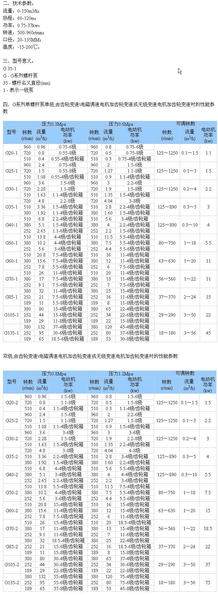 G型齒輪變速螺桿泵![]() G型齒輪變速螺桿泵 更多信息一、產(chǎn)品概述 單螺桿是按迥轉(zhuǎn)嚙合容積式原理工作的 泵種,主要工作部件是偏心螺桿(轉(zhuǎn)子)和固定的襯套(定子)。 由于該二部件的特殊幾何形狀,分別形成單獨(dú)的密封容腔,介質(zhì)由軸向均勻推行流動,內(nèi)部流速低,容積保持不變,壓力穩(wěn)定,因而不會產(chǎn)生渦流和攪動。每級泵的輸出壓力為0.6MPa,揚(yáng)程 因定子選用多種彈性材料制成,所以這種泵對高粘度流體的輸送和含有硬質(zhì)懸浮顆粒介質(zhì)或含有纖維介質(zhì)的輸送,有一般泵種所不能勝任的特點(diǎn)。其流量與轉(zhuǎn)速成正比。 傳動可采用聯(lián)軸器直接傳動,或采用調(diào)速電機(jī),三角帶,變速箱等裝置變速。 這種泵零件少,結(jié)構(gòu)緊湊,體積小,維修簡便,轉(zhuǎn)子和定子是本泵的易損件,結(jié)構(gòu)簡單,便于裝拆。 |