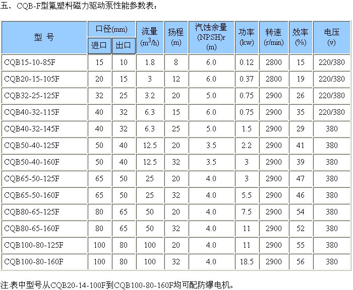 CQB-F型襯氟磁力泵一、產(chǎn)品特點: CQB-F型氟塑料磁力驅(qū)動泵防漏設(shè)計取消了軸封,利用磁力偶合間接驅(qū)動,完全消除了滴漏的煩惱,絕不污染使用場地。 由于泵的過流部分選用“氟塑料合金”制造。可連續(xù)輸送任意濃度的酸、堿、強氧化劑等腐蝕介質(zhì)而毫不受損。 二、工作原理: 驅(qū)動裝置采用主動磁鐵聯(lián)軸器直接裝在電機軸上,泵室完全封閉,通過磁力偶合間接驅(qū)動泵軸上帶磁鐵的葉輪旋轉(zhuǎn)結(jié)構(gòu)緊湊、安全節(jié)能。 堅固耐用的泵體結(jié)構(gòu)雖然接觸液體部分是氟塑料,但泵外殼是金屬材料,故泵體足以承受管道的重量及抵受機械性沖擊。 三、主要用途: 本產(chǎn)品 適用于:石油化工、制酸制堿、有色金屬冶煉、汽車制造的酸洗工藝、稀土分離、農(nóng)藥、染料、醫(yī)藥、造紙、電鍍、無線電等行業(yè)。 使用溫度: 四、型號意義: