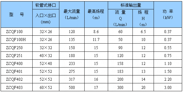 本泵采用外混式軸向回水泵體結(jié)構(gòu),泵體由吸液室、儲液室、蝸殼、回流孔、氣液分離室等部件組成。泵啟動后,在離心力的作用下,吸水室中的剩余液與進(jìn)液管路中的空氣被葉輪攪拌成氣水混合物,混合物經(jīng)蝸殼進(jìn)入氣液分離室,隨著速度減慢,導(dǎo)致氣水分離,空氣由泵出液口排出,液經(jīng)回水孔返回泵內(nèi),經(jīng)過多次循環(huán),進(jìn)液管道中的空氣排凈,使泵內(nèi)形成一定的真空度,達(dá)到自吸的作用。 五、性能參數(shù):