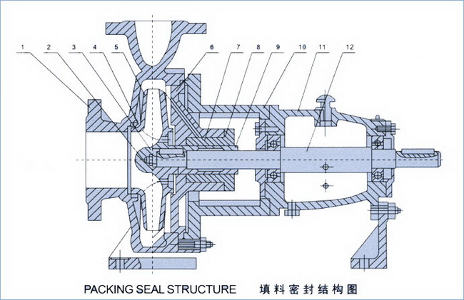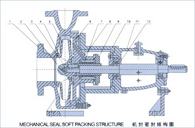![]() IH型化工泵結(jié)構(gòu)圖1、泵體2、葉輪螺母3、止動(dòng)墊圈4、密封環(huán)5、葉輪6、泵蓋7、機(jī)械密封8、填料壓蓋9、軸套10、中間托架11、懸架12、泵軸