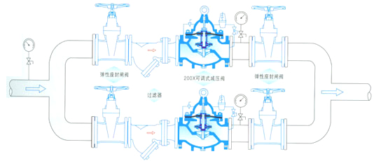 200X可調式減壓閥是一種利用介質自身能量來調節與控管路壓力的智能閥門。用于生活給水\消防給水及其他工業給水系統,通過調節減壓導閥,即可調節主閥的出口壓力。出口壓力不因進口壓力、進口流量的變化而變化, 地將出口壓力維持在設定值上,并可根據需要調節設定值以達到減壓目的。該閥減壓精確,性能穩定、 、安裝調節方便,使用壽命長。