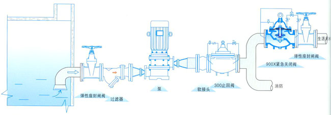 產品概述 900X緊急關閉閥是一種用于消防用水與生活用水并聯的供不系統中,用業調配供水方向的閥門。當火災發生時,消防急需大量用水,立即切斷生活用水,確保足夠的消防用水;當消防停止用水壓力減小時,閥門自動打開,呈常開狀態,恢復生活供水。該辛苦合系統無須另設專門的消防單獨供水管網,大大地節約了建設成本和用水量。閥門控制靈敏度高, ,調試簡便,使用壽命長。 典型安裝示意圖